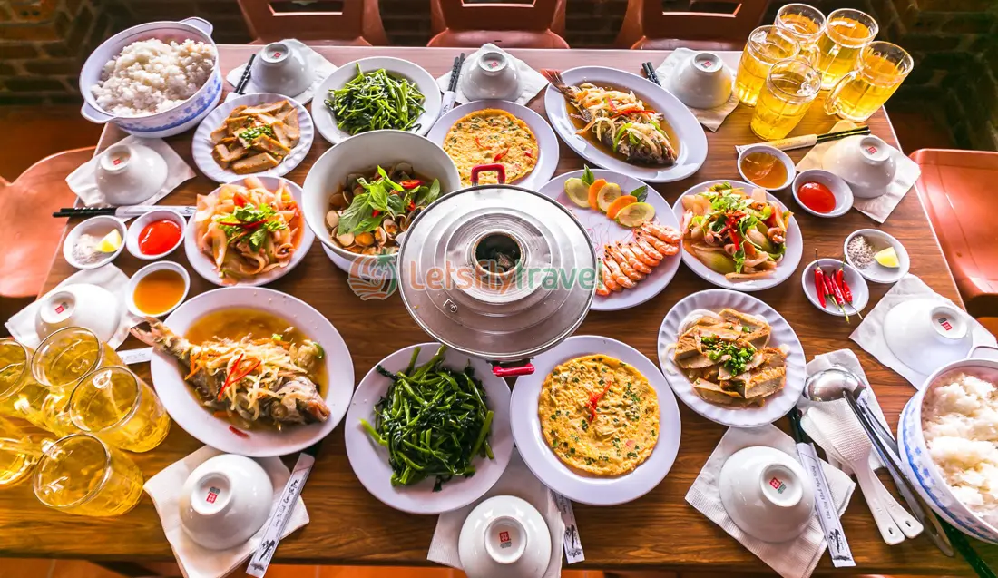 Sau đó là bữa trưa tại nhà hàng với thực đơn 11 món. Quý khách có thể thưởng thức thêm hải sản tươi sống trên những nhà hàng nổi (chi phí tự túc).